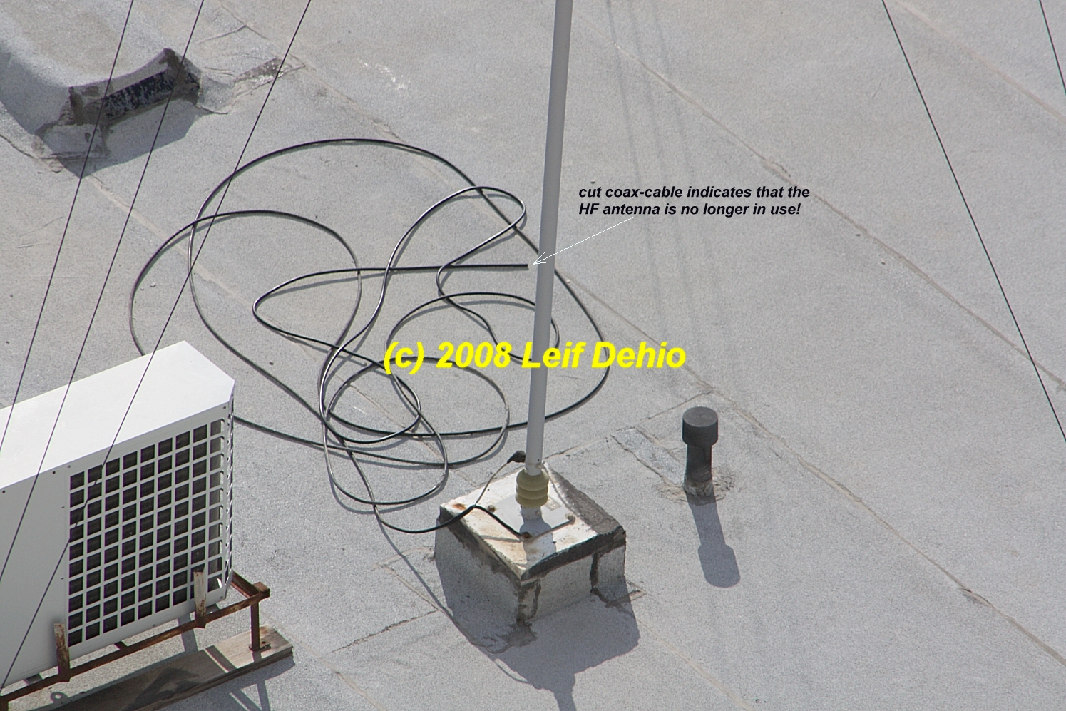 Embassy building with "guyed" HF vertical and vertical V/UHF antenna