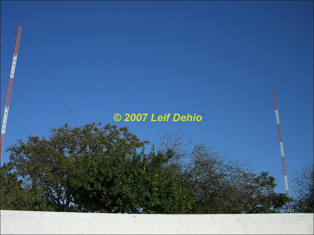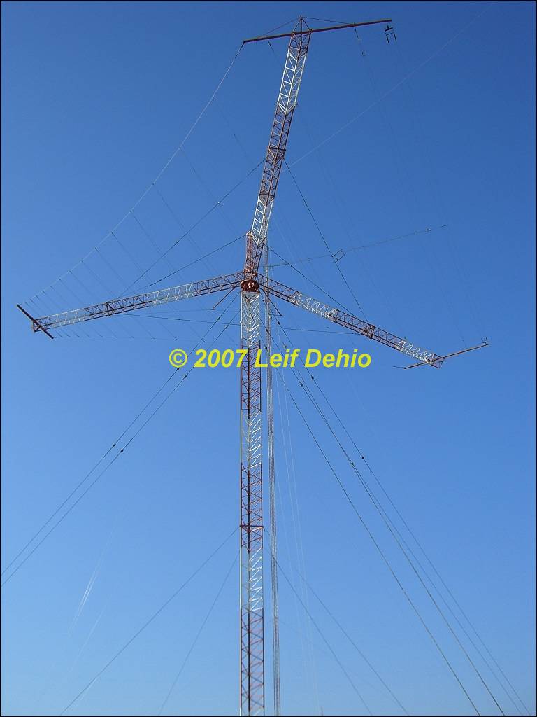 Rotateable horizontal wire Log Periodic, Inverted Cone antenna, tower of LF antenna and broadband HF dipole
