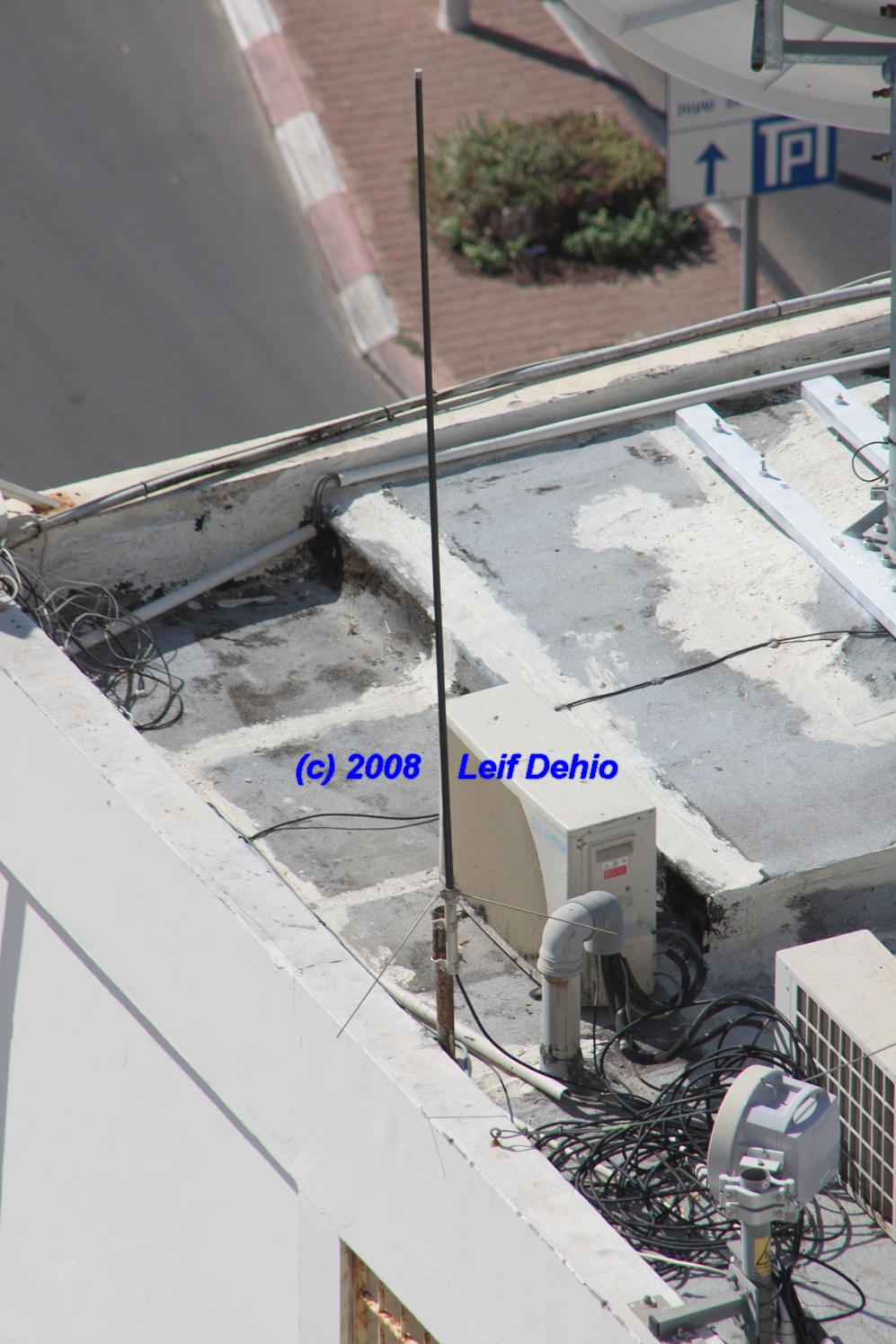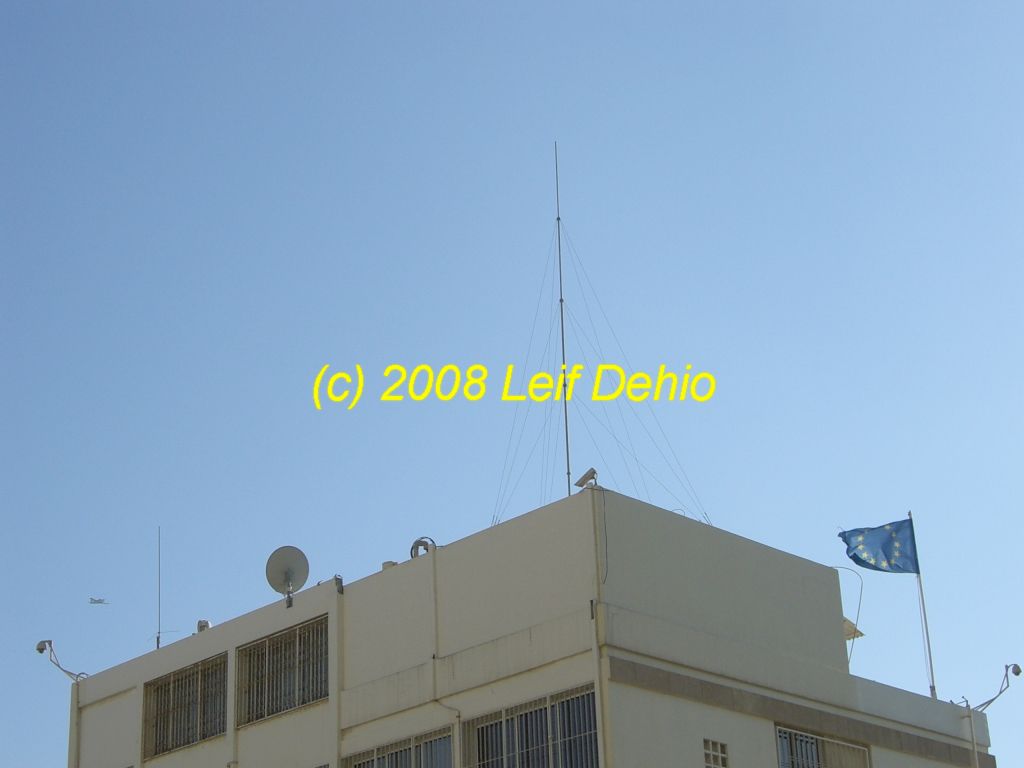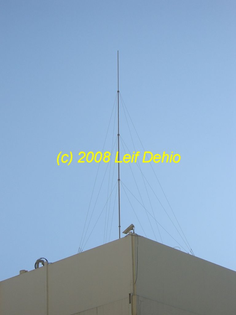 Embassy building with "guyed" HF vertical and vertical V/UHF antenna