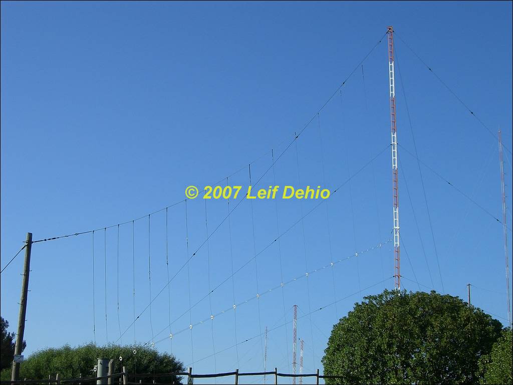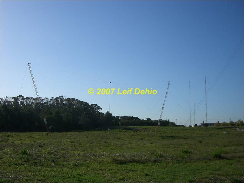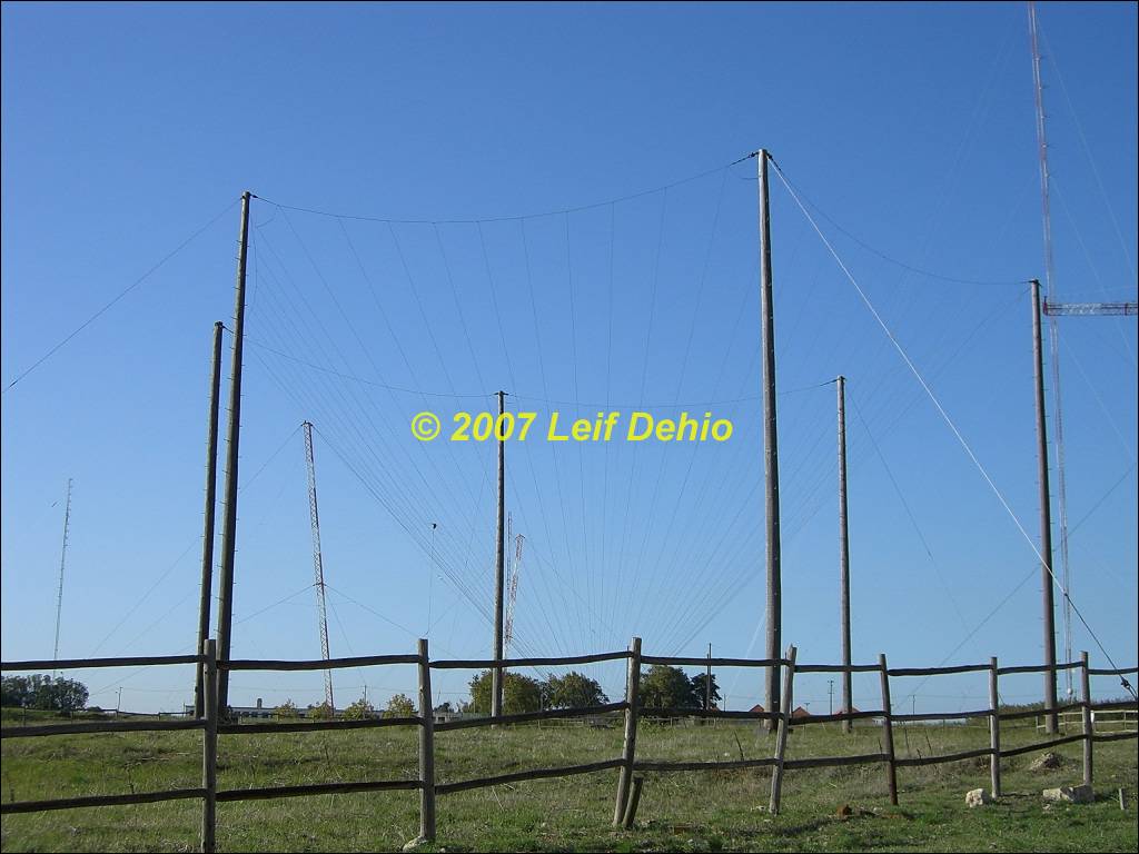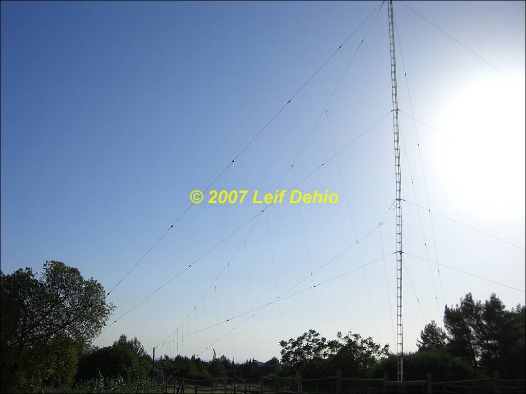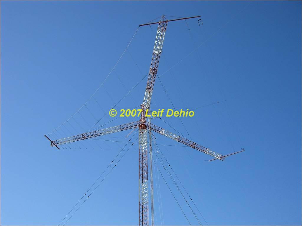 Rotateable horizontal wire Log Periodic, Inverted Cone antenna, tower of LF antenna and broadband HF dipole
