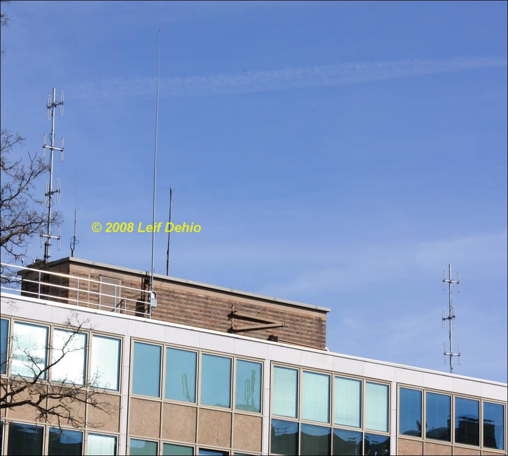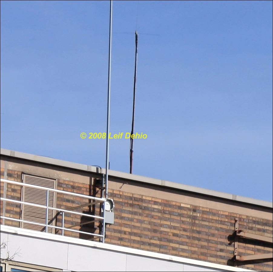FAA 5522 HF whip antenna and several V/UHF antennas on consulate roof